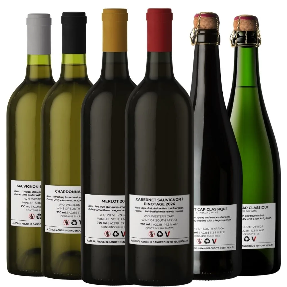 | INCLUDES: | Cabernet Sauvignon / Pinotage 2024, Merlot 2023, Chardonnay 2024, Sauvignon Blanc 2024, Brut Cap Classique NV, Nectar Cap Classique NV |