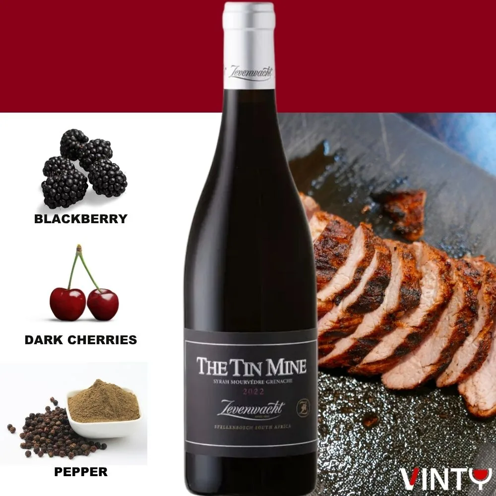 The Tin Mine Red is Zevenwacht’s showpiece Rhône-style blend — Syrah and Mourvèdre from estate vineyards on south-westerly and westerly slopes of Stellenbosch, at altitudes between 100m and 200m above sea level. The 2022 vintage won Best Rhône-Style Red Blend at the 2025 Investec Trophy Wine Show — widely regarded as South Africa’s most rigorous wine competition.